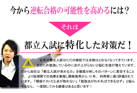 本人の受験に対するやる気を感じられず、成績も上がらずという悪循環でした。目標に向かって努力することの大切さを受験を通して経験してほしいと思っていました。本人に都立受験の意向を今一度確認し、すでに冬休みに入る頃だったので合格のための短期で解放テクニックを身に付けられる教材を探しており御社のHPに出会い、これだ!!と思い購入しました。