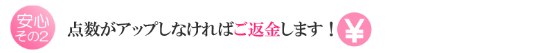 点数が上がらないのにお金をいただくつもりはありません。きちんとやっていただいたのに点数が変わらない場合には30日以内であればご返金をいたします。「きちんと」の定義は、下記の「ご返金の規約」の(1)(2)(3)の3つを満たしていることです。