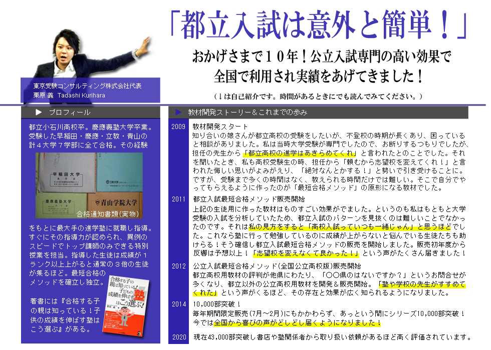 2026年受験版【理科】収録内容 ※中学3年間という膨大な出題範囲において、何が出るかは最重要情報のため一部掲載とさせていただきます ●理科は『1分野』と『2分野』があるが、○分野のほうが少ない時間で得点が伸びる! ●資料の読解法を身につければ、暗記を一切せずに正答率を50%にアップさせられる! ●『実験問題』の最大のヒントは意外にも○○!そこから逆算すれば、知らない実験でも簡単に解ける! 【ココがすごい!】 「理科=暗記」と思い込んでいませんか?確かに基本的な知識の暗記は必要ですが、実は都立入試では「思考力」を重視する傾向にあります。具体的には「実験・観察資料」を見て考える力です。塾などではこうした資料を丸暗記させるので、見たことのない実験や資料だとお手上げ。という場合が多いのですが、実はこれは「実験・観察資料」のなかにヒントや答えがあるので「考えれば」解ける問題が多くあるということなんです!都立が求めている「思考」をすれば、「今のままでも」得点アップできる可能性があるということです!! |