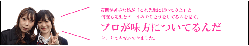 この教材は、個別指導をそのまま教材にしたので 「となりで教えてくれているみたい」 という声をいただくほどわかりやすさに定評がありますが、 やはりお子さんが「うちの子は教材を一人でできるのか?」と不安ですよね。 そこで私たちはお子さんひとりひとりに合わせて、1教科につき30日の個別メールサポートをしています! 3教科なら90日もついてきますので、 お子様には、いつも都立高校入試のプロが味方についていると思ってください! 従来の通信添削の類ですと 、すぐに質問ができないので「わからないとこがあると立ち止まる ⇒ 教材がどんどんたまる」となりがちですよね。 ですが、当社のサポートは お子さんが疑問に思ったらすぐに質問でき、 1〜3日で返事がくるので、 立ち止まらず効率的に都立高校の入試対策を進められます。 例年「このサポートが本当によかった!」「サポートのおかげで子どもは自信が持てた」 と、ほんとうに好評なサポートです。