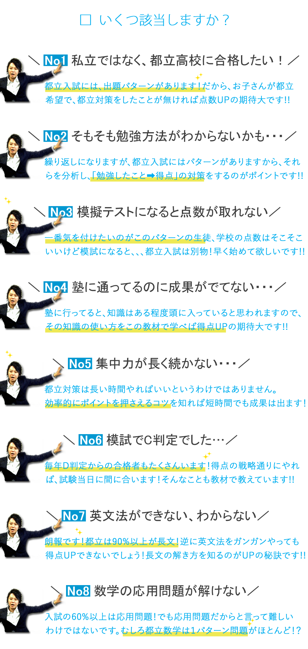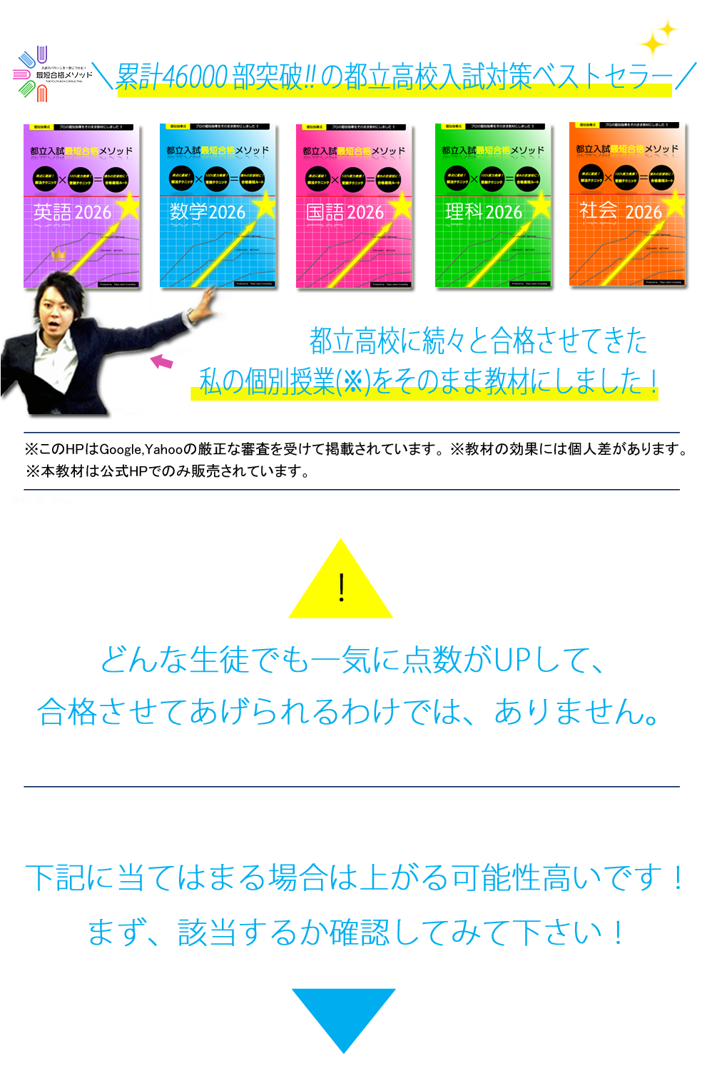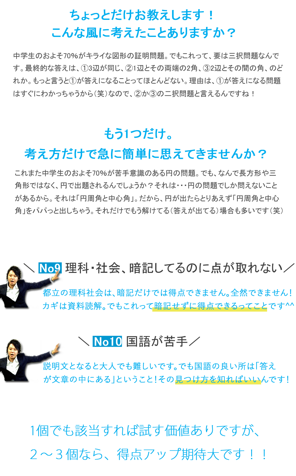 都立高校入試にパターンがあることを知って、「もしかして入試に出やすい問題が分かる?」とピンときてたら鋭いです! 右の画像を1つ1つ確認してみてください→ |