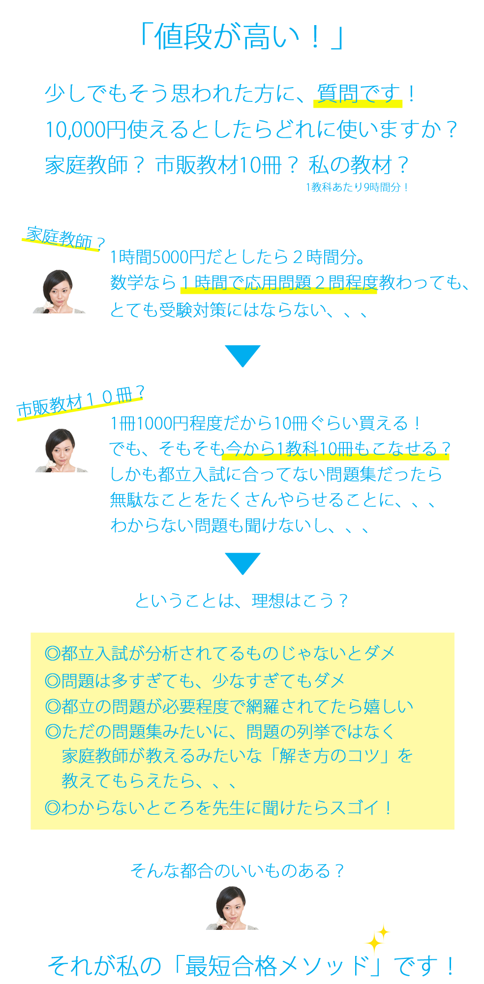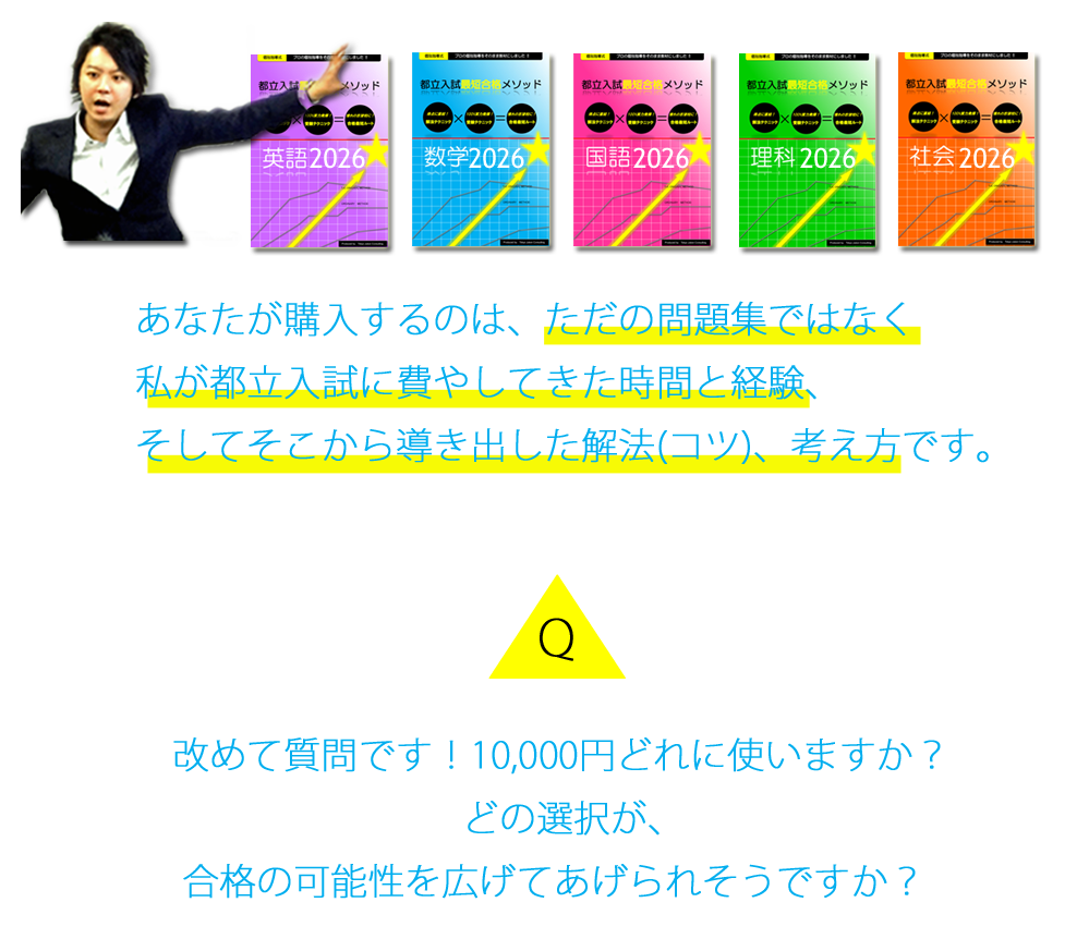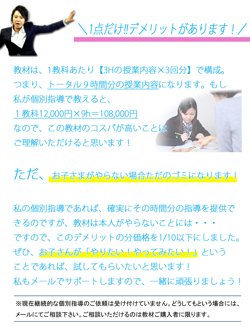 ![]() 【理科のセット内容】 ・プロの解説テキスト1冊[152P] ・厳選問題集3冊(50分で解く模試形式) →最短:1日1冊×3日 ・メールサポート30日間 |