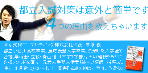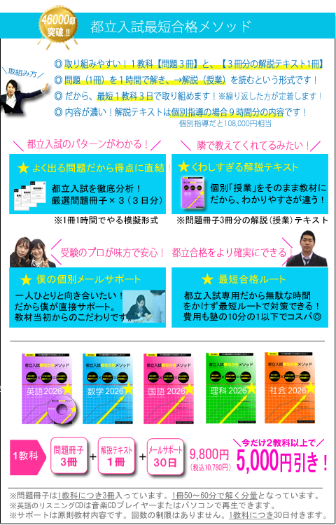 と、思った?うん、そういうことだね!教材販売当初は「本当に短期間で点数が上がるようなことがあるんですか?」というお電話をたくさんいただいて。。疑われまくったんだけど。。^^笑(皆さん不安ですよね)。たしかに「どんな問題も解けるようにする」ことが目標だとそれには数年かかるよね。でも「都立入試によく出る問題だけを解けるようにする」のであれば、短期間でできそうじゃない?つまり、僕がやっていることは、「都立入試問題を徹底的に分析し、共通して問われている能力をあぶりだし、問題を厳選する」→「その問題を最短ルートで解く技術(コツ)を教える」→「勉強したことが得点につながるので短期間で成果を出せる」ということ。これが僕の受験対策の勉強法(メソッド)なんだ!僕はもともと大学受験の講師で、早稲田・慶應といった難関大を分析していたから、ハッキリ言って都立の高校入試の程度なら余裕でパターンがわかる^^