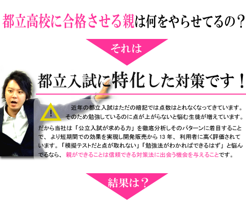 塾に通って勉強する習慣もそれなりに身に付いていたが、志望校の合格ラインまでなかなか届くことはできず、勉強の仕方が悪いのではと悩んでいました。そんな時、都立高校の問題を分析し、出題傾向から効率的な勉強方法を具体的に説明されているこの教材を見つけました。短期間で成果が望めるのではと直感的に感じて購入することにしました。その際他の購入者の方々の感想を参考にさせていただきました。