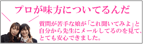 「プロが味方という安心感があった」保護者様から良くいただく言葉です。この教材にはメールサポートが付いています。受験指導というのは一朝一夕でできるものではなく、実際に多くの生徒を指導してきた「経験」と入試問題を見抜く「分析力」が必要です。だからこの教材は、アルバイト学生などに任せるのではなく、「僕が」一人ひとり個別にメールサポートしていて、それがずっと続けているこだわりです!