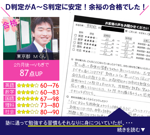 この教材を使ってみて本当に点数が上がりました。塾のテストや模擬テストの点数が間違いなく上がりました。塾の費用よりも安く、ここまでグングンと点が取れたのには本当にビックリです!やっぱり迷わずにす縲怩チと信じてやらせてみて良かったです。息子も「塾も役に立たなかったわけじゃないけど、合格はこの教材のおかげ」だと言っていました。