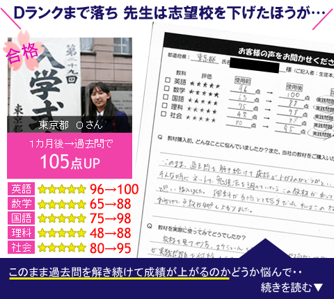 このまま過去問を解き続けて成績が上がるのかどうかということで悩んでいました。そんな時にネットで勉強法を調べていたらこの教材がのっていて「これしかない」と思い購入しました。理科が当時とても苦手だった私はこの教材を解きまくったおかげで点数が40点も上がりました。