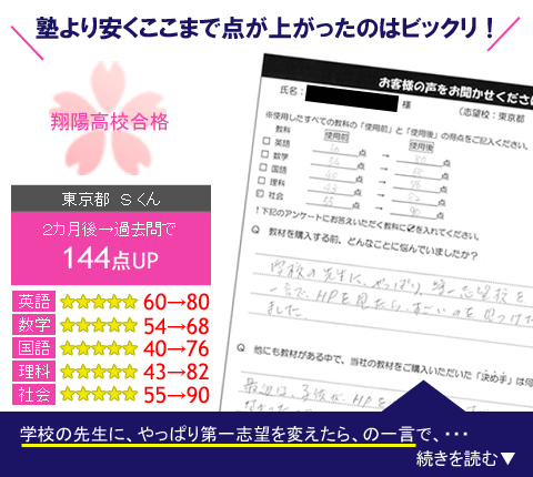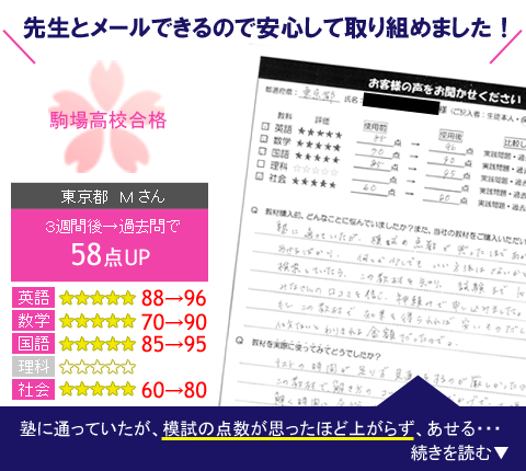 教材が届くやすぐに取り組み始め「これ良いかもしれないワ」と明るい口調に、実は私も本人が学校に行っていると時、テキストを読ませて頂き「へ~なるほど私が中3だったら絶対高得点取れそう」と親の私が興味津々。お電話も丁寧に対応してくださり、プロが研究されている教材だと実感し、息子は「栗原先生が次にこうやるといい」とアドバイスくれるのが心強かったようです。結果合格となり、あっと驚いてしまいました!テキストの効果を祈りつつ信じて本当に良かったと思います。